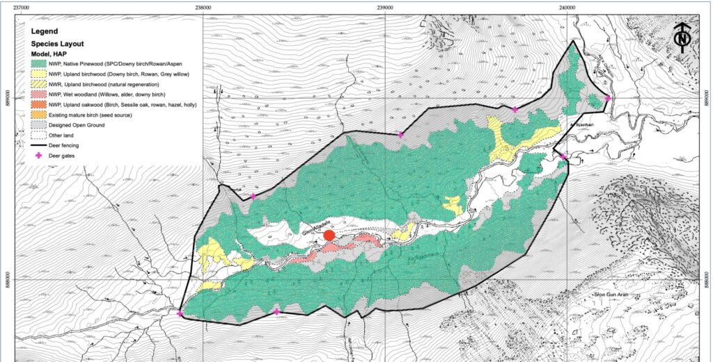 This map breaks down the areas in which the rewilding will take place alongside river banks, each colour represents a different variety of trees.
