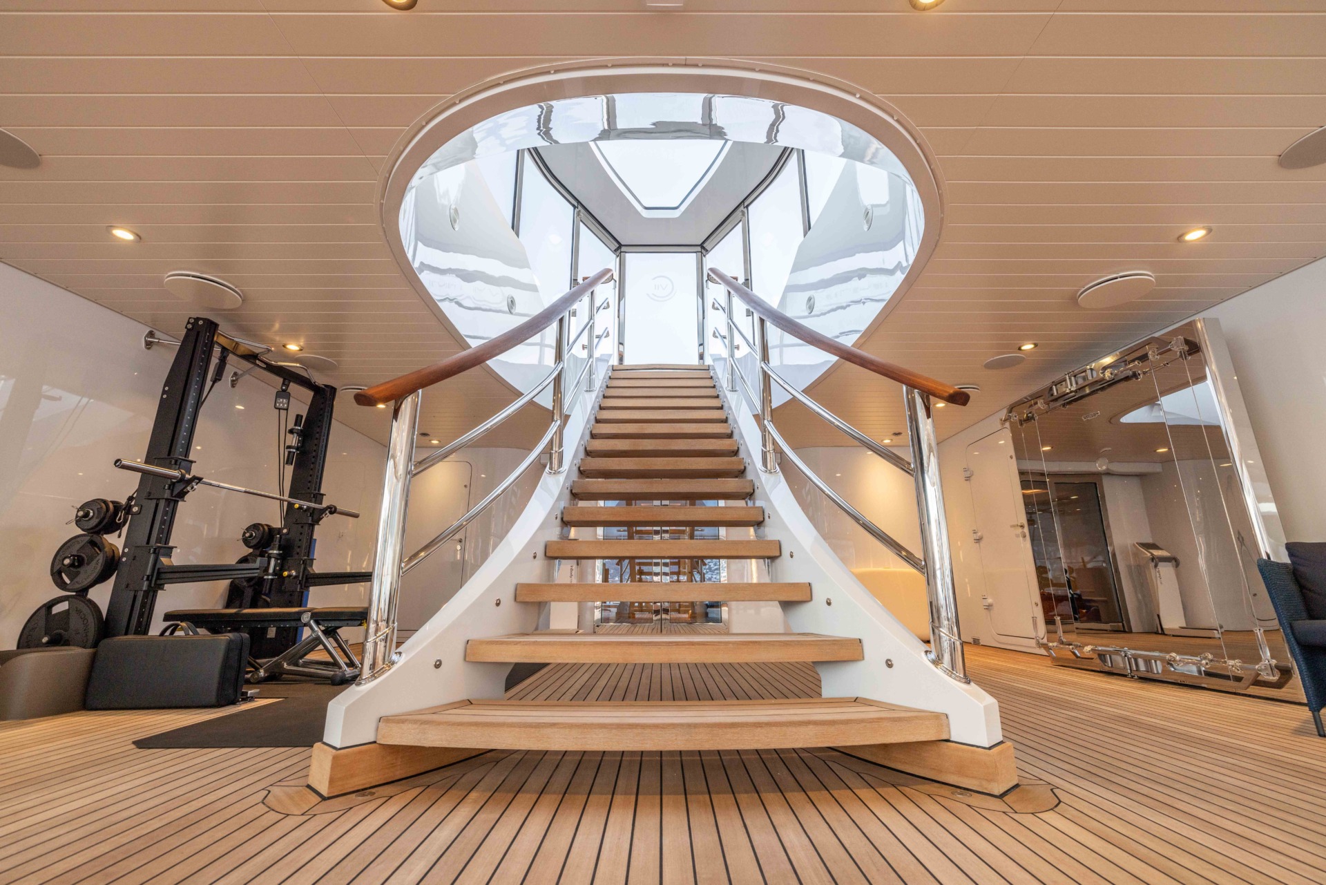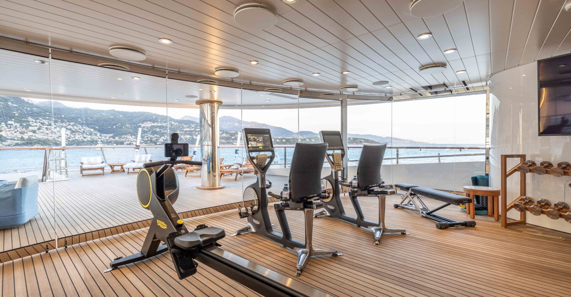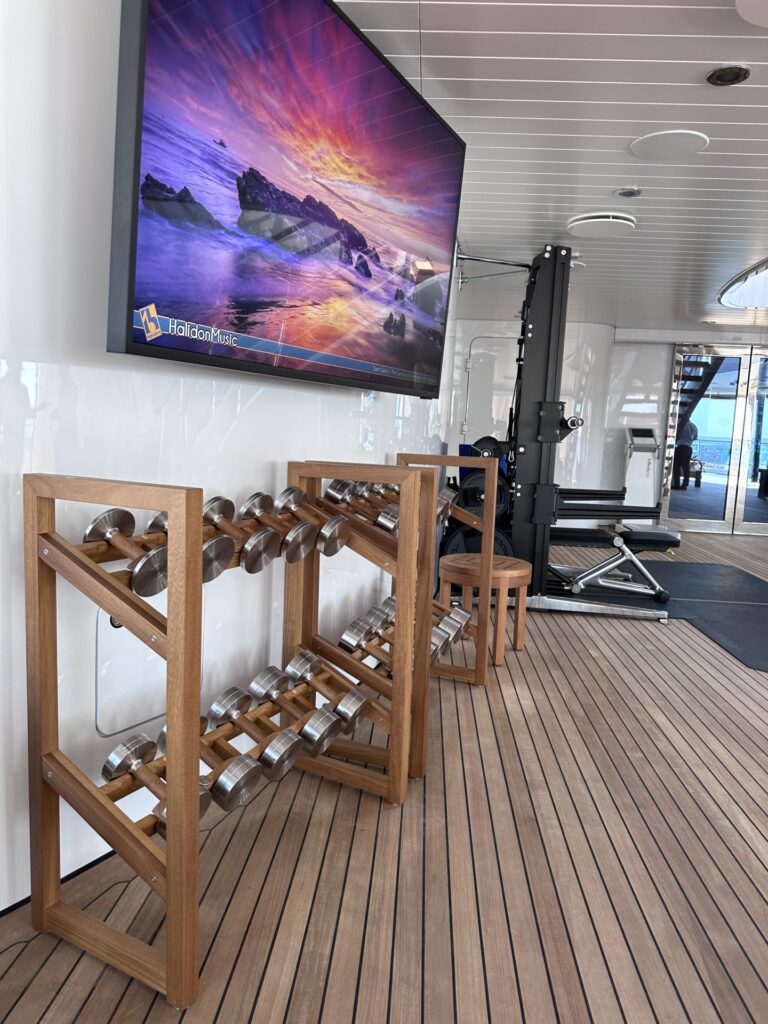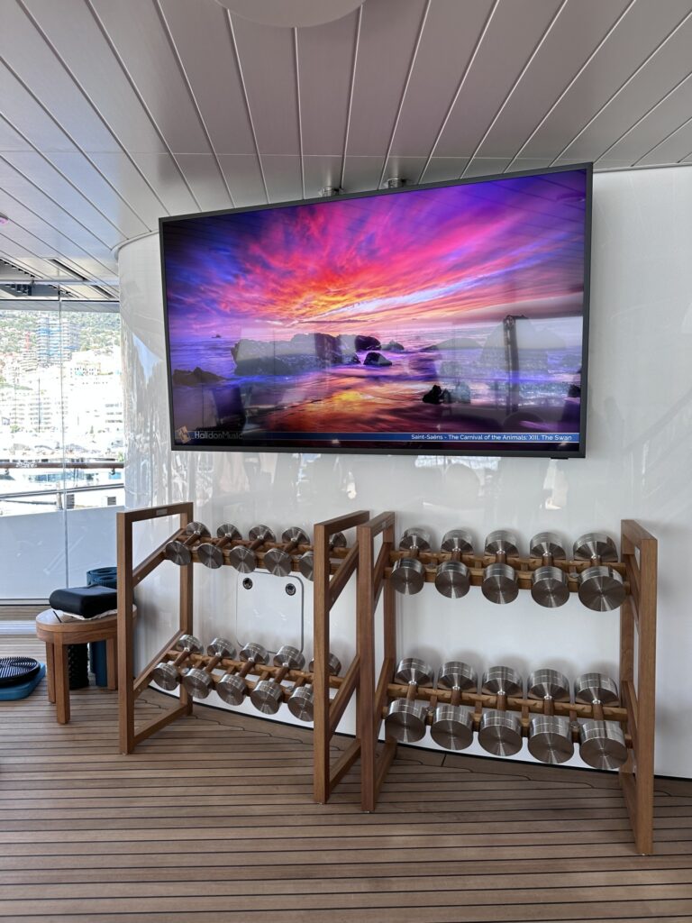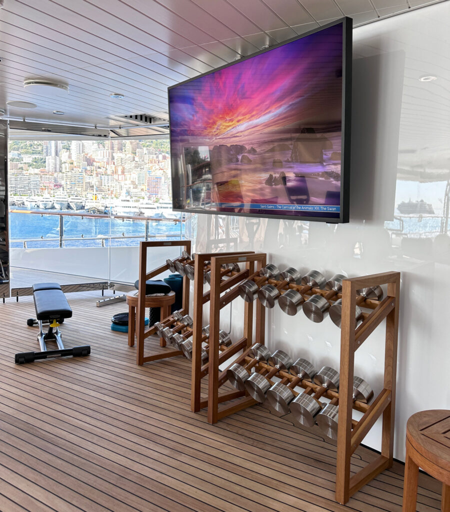 Our dumbbell rack in Iroko takes pride of place underneath a large television on the aft deck gym – which is situated in a spacious and airy winter-garden area.